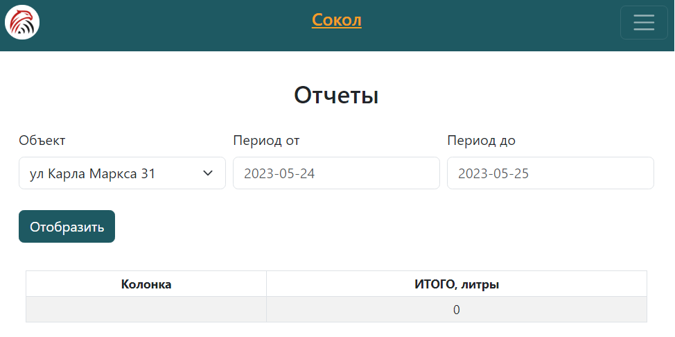 Пользователь может формировать отчеты по выбранным колонкам за заданный период времени. В отчетах содержится информация об общем количестве литров, отпущенных колонкой за заданный период времени, а также суммарное значение литров, отпущенных на всех выбранных колонках за этот же период времени. Отчет можно сохранить на персональный компьютер в формате csv.